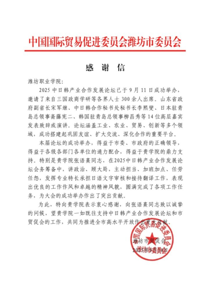 近日,中国国际贸易促进委员会潍坊市委员会发来感谢信,充分肯定我院在2025中日韩产业合作发展论坛中的贡献。论坛于9月11日成功举办,以“开放包容,合作共赢”为主题,吸引中日韩三国300余位政商学研代表参会,搭建工业、农业、贸易等领域的国际交流平台。我院主动对接区域需求,以“校地命运共同体”理念为引领,选派教师深度参与论坛筹备工作,为论坛注入“潍职智慧”。论坛中,我院教师张语熹依托专业特长承担日语文字审核和接待翻译等工作,...更多 -