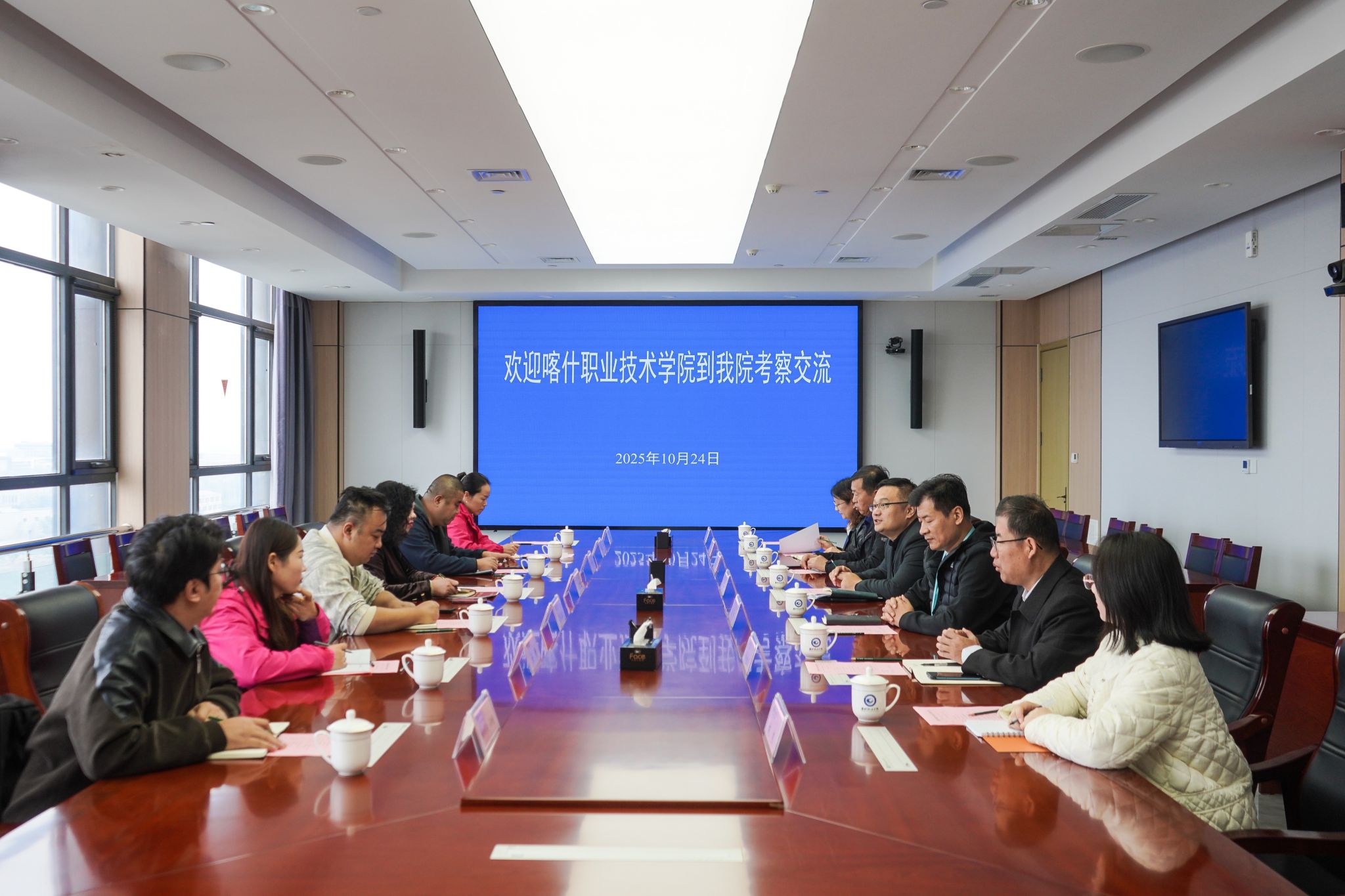10.24 / 2025 喀什职业技术学院到我院考察交流10月24日上午,喀什职业技术学院招生就业处处长李芝琴率队到访学院考察交流。学院院长韩瑞东,党委委员、组织人事处处长于涛接待客人。招生就业处、教务处等相关职能部门、二级学院负责同志参加活动。会上,双方共同观看了潍坊职业学院宣传片。于涛介绍了学院的发展历程、办学特色,并与客人就招生就业、教务管理、专业建设等展开了深入探讨与经验分享。李芝琴对我院近年来取得的发展成就表示由衷赞赏,希望以此次交流为契机,进一步巩固与我院在人才培养、...更多