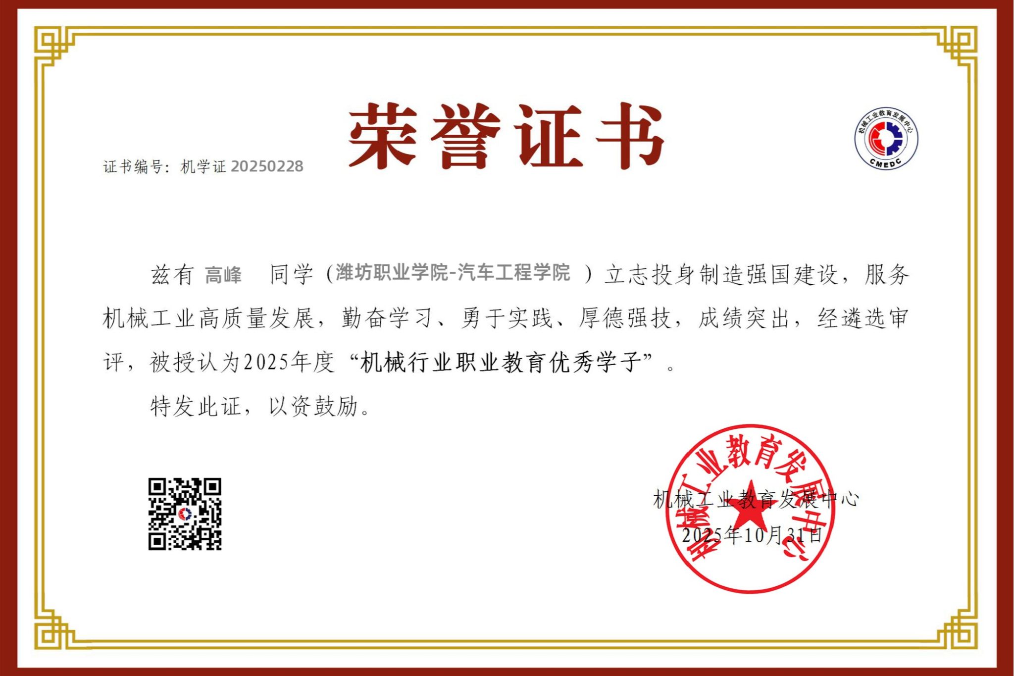 近日,首届“机械行业职业院校优秀学子”遴选认定工作结果正式揭晓。经院校推荐、专家评审及公示程序,全国共496名2025届毕业生获此殊荣。我院机电工程学院刘璐璐、崔晓阳,汽车工程学院高峰、潘洪俊四位同学凭借优异的综合素质和突出的专业技能成功入选。此次“机械行业职业院校优秀学子”遴选活动,由机械工业教育发展中心牵头组织,旨在深入贯彻国家制造强国战略,响应建设一流产业技术工人队伍的时代号召,浓厚“学制造、干制造、...更多 -