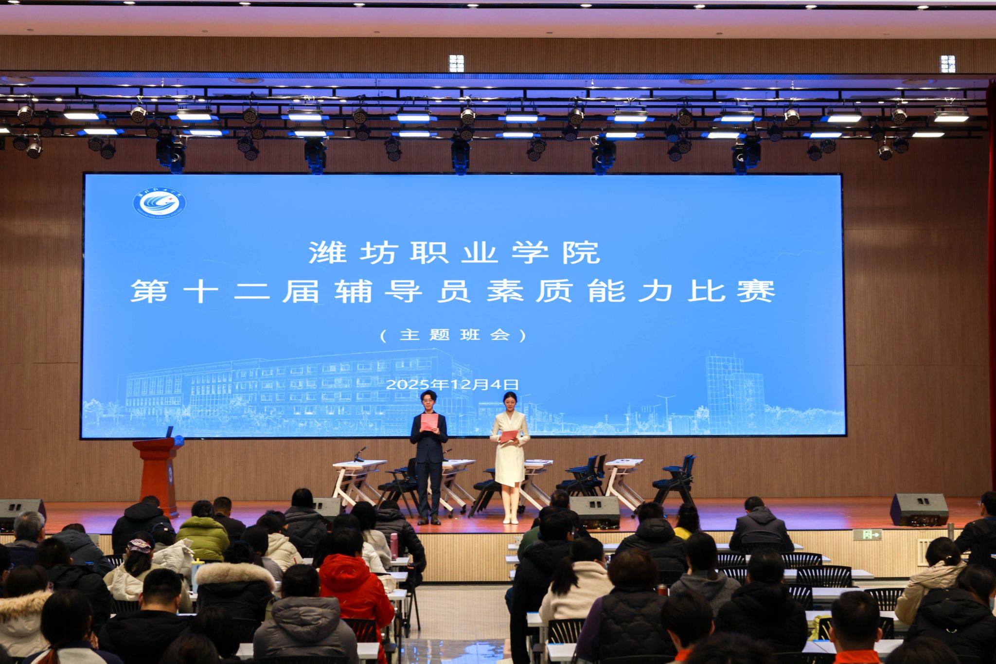 12月4日下午,学院在滨海校区综合楼一楼报告厅举办第十二届辅导员素质能力大赛主题班会环节的比赛。学院党委委员、副院长任培华出席活动,学生工作处、教师工作部及各二级学院党总支主要负责同志担任评委,全体辅导员观看比赛。本次班会采用现场展示的形式,每位选手进行2分钟方案阐述与8分钟情景再现。经二级学院初赛选拔,共有13名辅导员晋级决赛。参赛选手紧密围绕思想引领、价值观塑造、学风建设、心理健康、安全教育及生涯规划等方面,...更多 -
