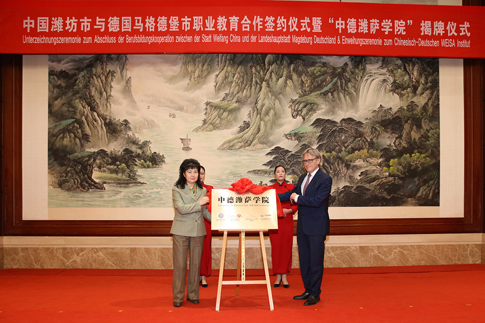 3月13日上午,潍坊市与德国马格德堡市职业教育合作签约暨中德潍萨学院揭牌仪式在富华国际会议中心隆重举行。德国马格德堡市副市长莱纳•尼采,山东省教育厅副厅长白皓,潍坊市副市长李平,德国WMU教育集团总裁弗兰克•温茨林、首席顾问汉斯-约阿希姆•巴尔,德国HWK手工业行会格拉市职业教育培训中心国际部主任卡斯特•萨克斯,德国马格德堡奥托·冯·格里克职业教育中心学校校长汉斯-尤尔根•麦尔,德国WMU教育集团中国首席代表...更多 -