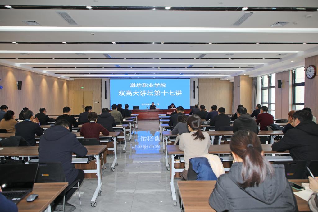 1月11日,学院在滨海校区举行“双高大讲坛”线下第十七讲。北京外国语大学教授、中国职业技术教育学会副会长孙善学作《产教融合理论与实践》专场报告。学院党委副书记韩瑞东,党委委员、副院长贺志强,学院领导李瑞昌,副院长陈美霞,党委委员、组织人事处处长付一明,党委委员、办公室(统战部)主任(部长)任培华出席活动。各部门、二级学院党政负责人及教学副院长,双高建设项目责任人及双高办成员等70余人听取报告。韩瑞东主持报告会。...更多 -