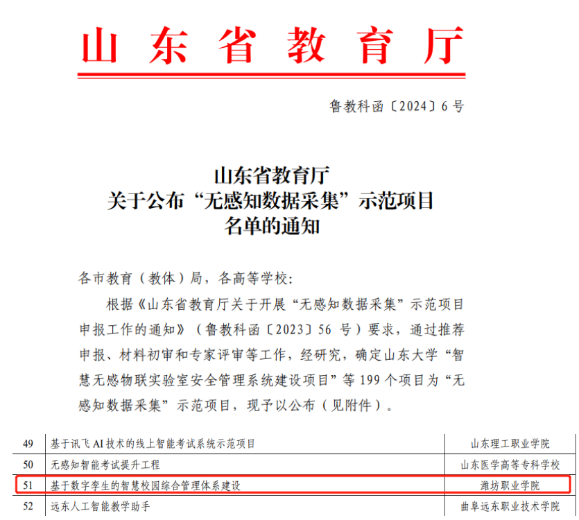 近日,山东省教育厅发布《关于公布“无感知数据采集”示范项目名单的通知》(鲁教科函〔2024〕6号),学院“基于数字孪生的智慧校园综合管理体系建设”入选全省“无感知数据采集”示范项目。该项目旨在通过遴选优秀的“无感知数据采集”教育数字化实践解决方案,培育 “无感知数据采集”教育数字化应用的新场景、新模式,树立可复制推广、可规模应用的“无感知数据采集”项目发展标杆。 学院“基于数字孪生的智慧校园综合管理体系建设”...更多
