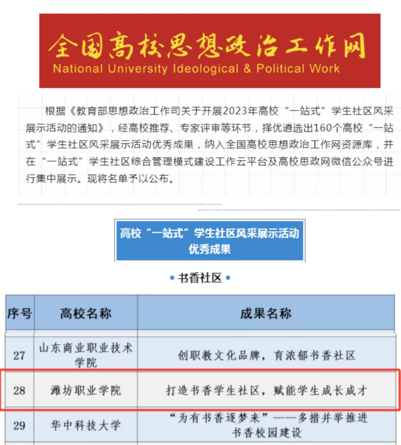 近日,由教育部思政司举办的2023年高校“一站式”学生社区风采展示活动优秀成果入选名单揭晓,经高校推荐、专家评审等环节,我院报送的《打造书香学生社区,赋能学生成长成才》成功入选风采展示活动“书香社区”模块优秀案例。该案例将被纳入全国高校思想政治工作网资源库,并在“一站式”学生社区综合管理模式建设工作云平台及高校思政网微信公众号进行集中展示。 此次展示活动由教育部思想政治工作司主办,旨在学习贯彻党的二十大精神和2023年全国两会精神,...更多 -