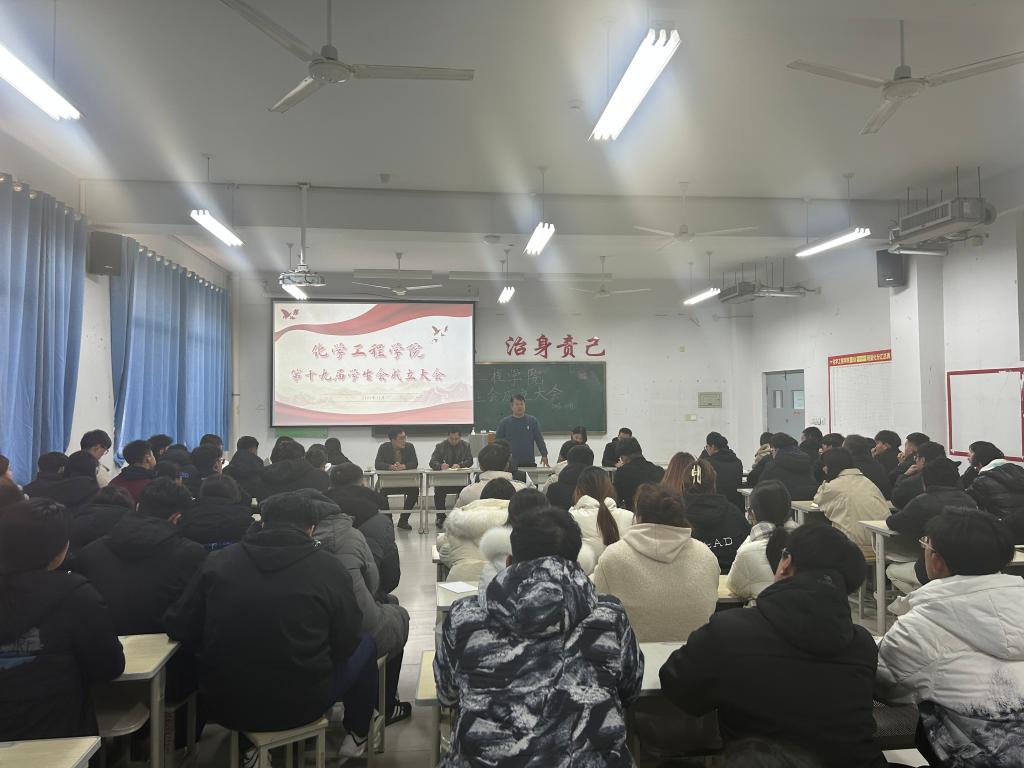 11月13日下午,化学工程学院第十九届学生会成立大会在惠泽1号楼A412教室举行。化学工程学院学生工作负责人、全体专职辅导员和学生会全体成员参加大会。 化学工程学院学生工作负责同志充分肯定了上一届学生会取得的工作成绩,并对新一届学生会成员提出了三点要求,一要提高认识,充分领会学生会工作的重要性,以身作则,起好带头作用;二要在实践中不断提升执行力,确保各项工作任务落实到实处;三要把服务同学放在第一位,...更多 -