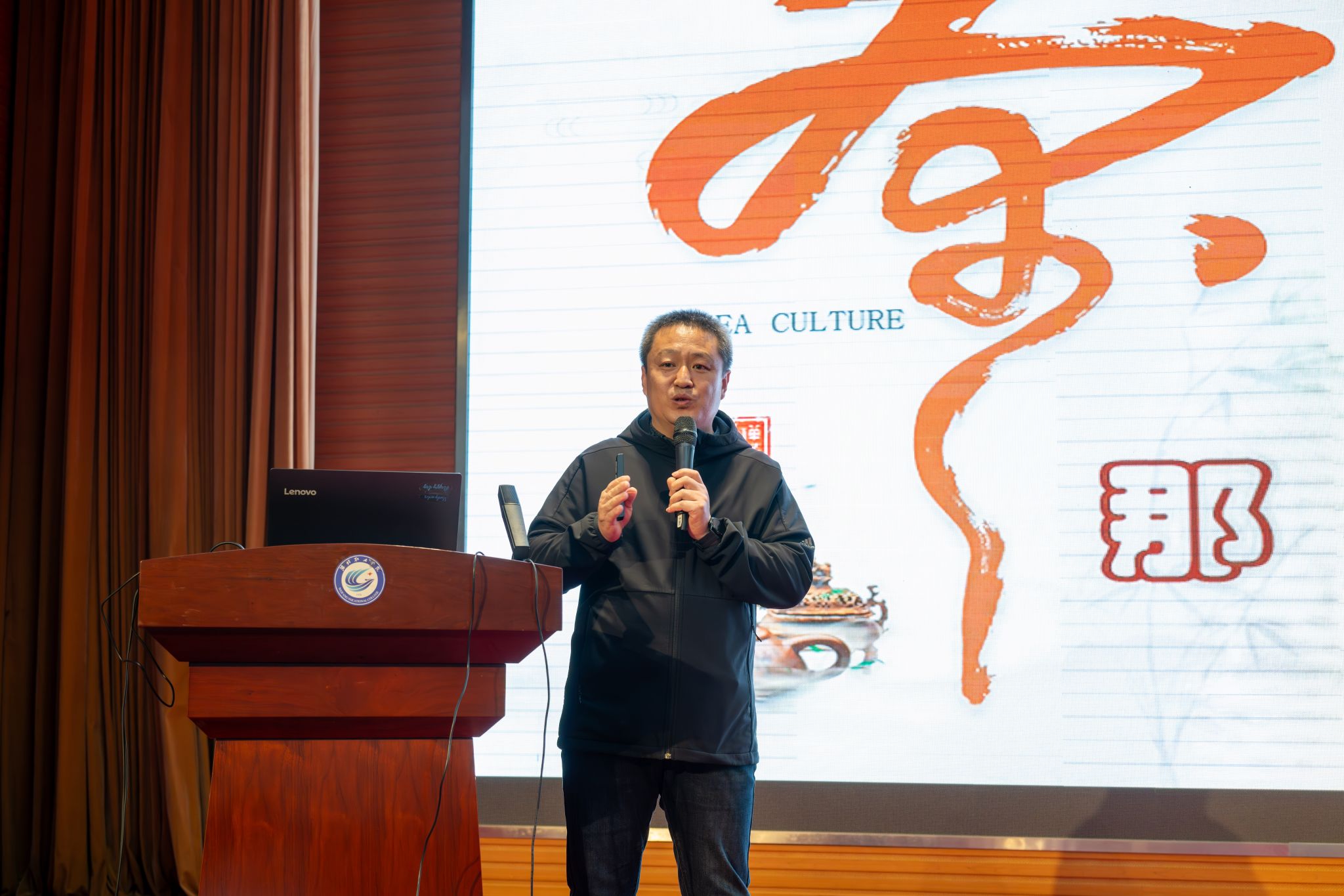 11月27日下午,学院第129场人文与思政讲座在滨海校区图书馆报告厅举行。通识教育中心姚德财老师作了题为“中华传统文化系列——‘茶’那些事”的专题讲座,2025级400余名学生参与。
