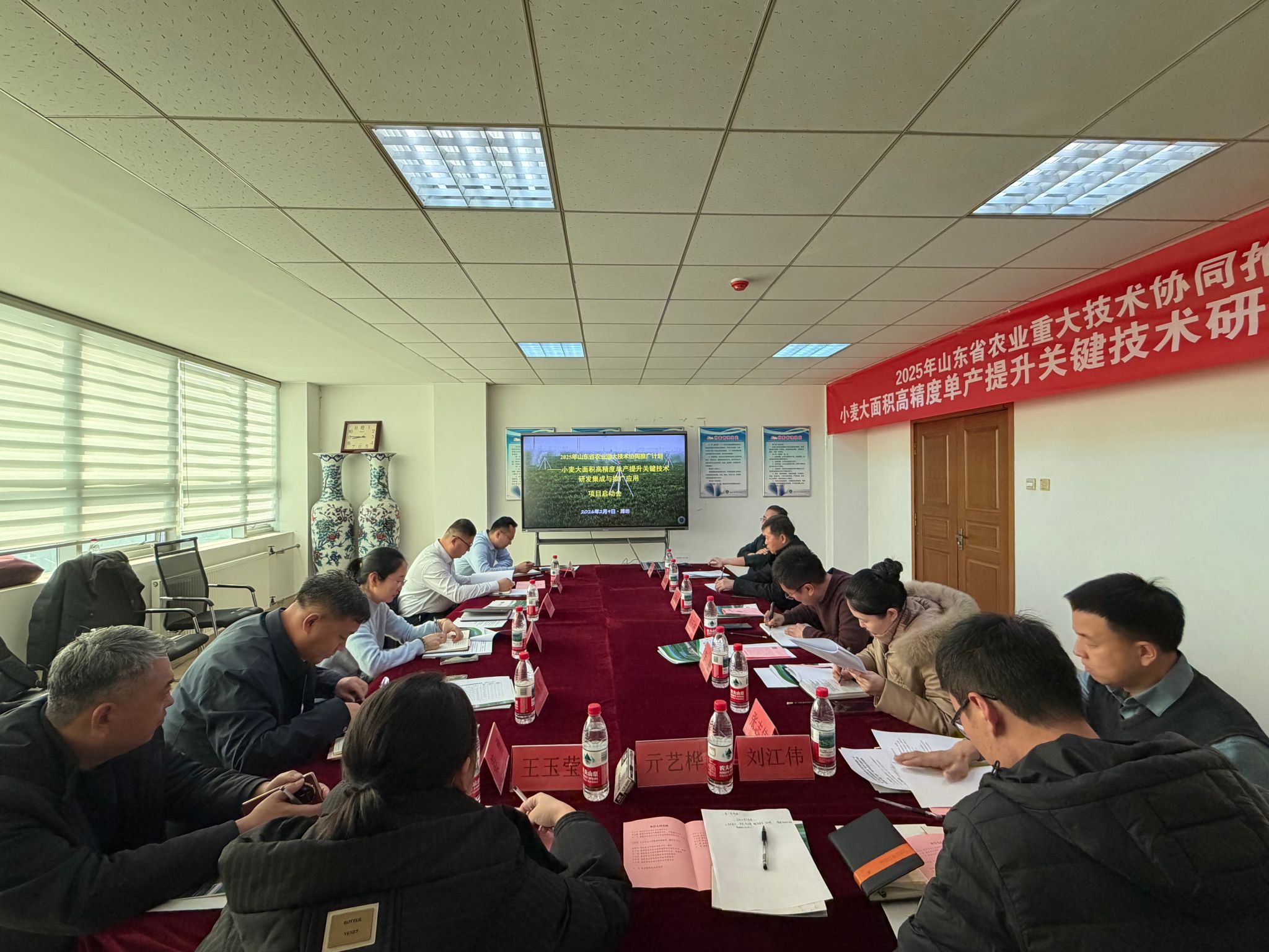 为推进2025年立项的山东省农业重大技术协同推广计划——小麦大面积高精度单产提升关键技术研发集成与推广应用项目落地,2月9日,我院院长韩瑞东率团队赴潍坊市农业科学院开展专项对接交流。潍坊市农业科学院院长袁柳天、潍坊市农业农村局科教科科长王文卓、潍坊市农技中心粮经科科长袁永胜,潍坊市农业科学院小麦所负责人于海涛、山东农业大学农学院代兴龙副教授,以及各方项目团队相关成员参与活动。