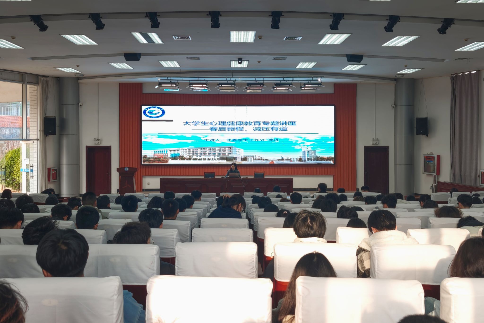 讲座由团委学生工作处孙进老师主讲。孙老师以《春启新程,减压有道》为题,围绕大学生普遍面临的压力问题展开讲解。讲座伊始,她通过趣味心理测试引导同学们直观感受自身压力状态,深入浅出地阐述了压力的定义、来源及其对身心健康的影响。