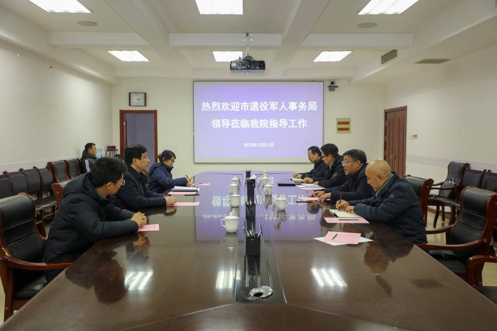 韩瑞东对李磊一行的到来表示热烈欢迎,介绍了学院办学历史、基本情况以及学院连续3年获评山东省高职院校办学质量考核第一名等发展建设取得的办学成果,充分表达了学院对退役军人培训工作的全面支持,并与客人共同观看了学院及退役军人职业教育学院宣传片。继续教育学院负责人介绍了退役军人就业创业服务平台情况,平台目前已有12家培训机构、72家企业入驻,提供工作岗位262个及线上培训课程100余门,为4200余名退役士兵注册用户搭建起线上服务平台。