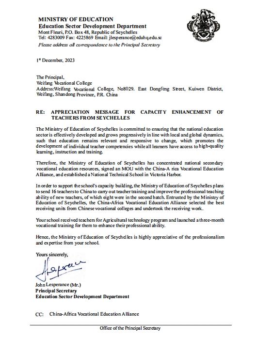 塞舌尔教育部感谢我院承担教师赴华能力提升培训项目