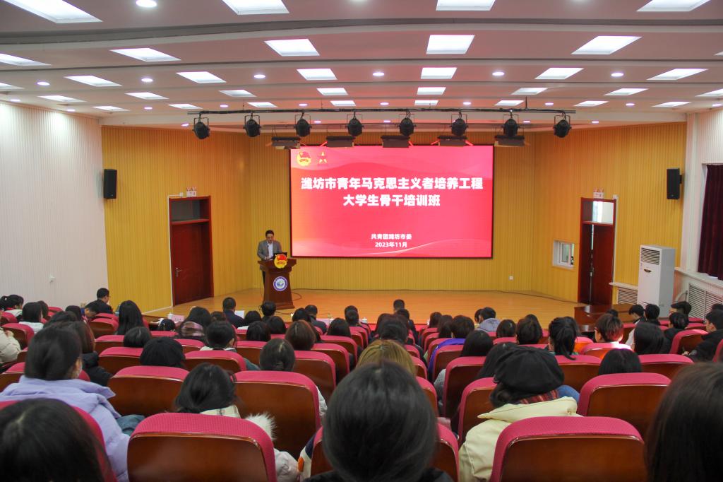 共青团潍坊市委副书记郭宴铭讲话,希望参训学员要坚定理想信念,树立远大理想,勇于开拓进取,练就过硬本领,锤炼高尚品格,争做时代新人。希望各高校团学组织要旗帜鲜明讲政治、团结引领广大青年进一步解放思想、主动作为、勇挑重担,坚定不移促改革,驰而不息从严治团,锻造昂扬时代风貌。