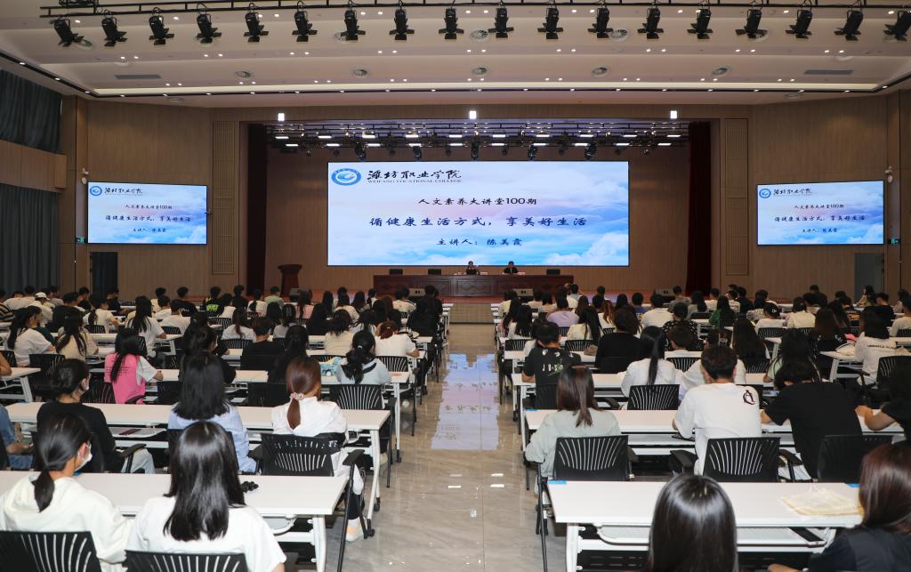陈美霞,学院副院长,博士后、教授,担任潍坊市政协委员,先后获得山东省教学名师、全国农业职业教育教学名师、潍坊市优秀科技工作者、潍坊市直机关优秀妇女干部等荣誉称号。讲座中,她以人的身心健康发展为主题,以“世界卫生组织关于健康的十项标准”和马斯洛的需要层次理论作为切入点,结合传统养生智慧《黄帝内经》和现代健康知识,讲述了如何从饮食、起居、运动、情志四个方面形成健康的生活方式,并借钟南山院士的事例,生动地阐释了健康体魄对个人发展的意义。讲座内容丰富蕴藉、深入浅出,使同学们充分认识到健康是个人成长发展的重要基石,并鼓励当代大学生要内外兼修,形成健康的生活方式。