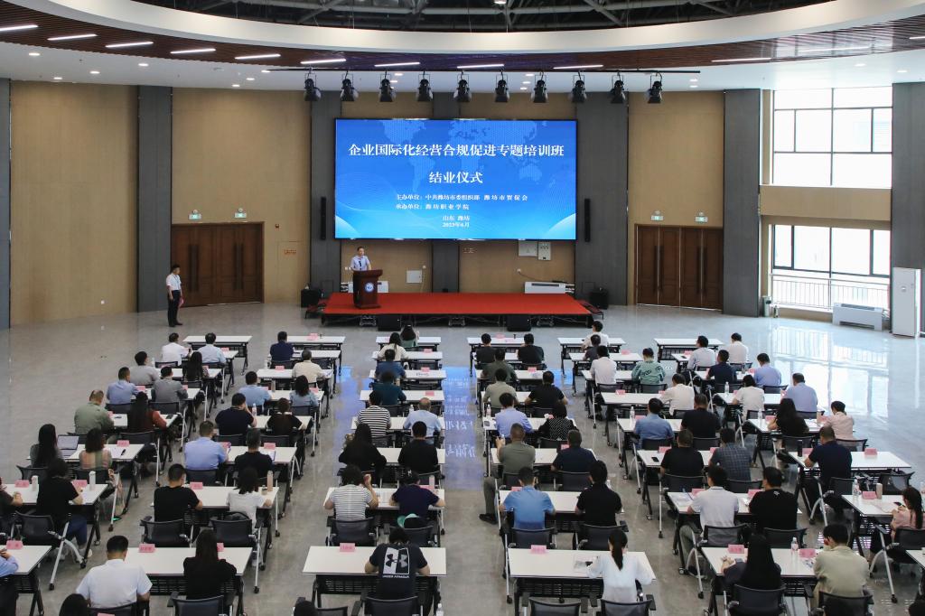 6月2日下午,由中共潍坊市委组织部、潍坊市贸促会主办,潍坊职业学院承办的“企业国际化经营合规促进专题培训班”在学院国际学术交流中心二楼报告厅举行结业仪式。潍坊市贸促会党组书记、会长胡文星,学院副院长陈美霞出席仪式,全体培训学员参加仪式。
