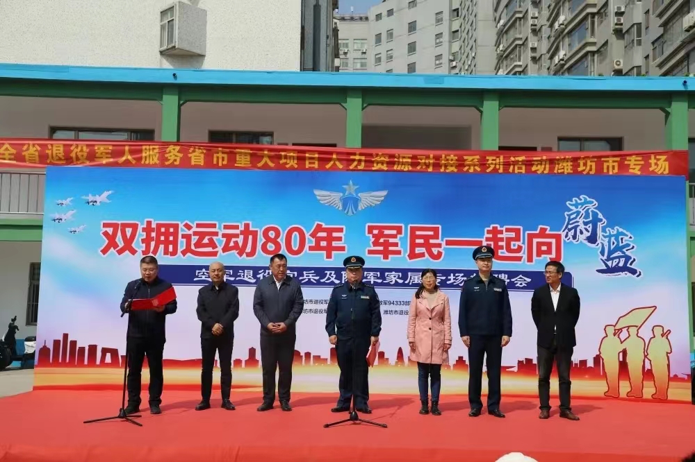 近日,我院与潍坊市退役军人事务局共同举办的“双拥运动80年,军民一起向‘蔚蓝’”——空军退役官兵及随军家属专场招聘会在学院奎文校区潍坊市退役军人就业创业孵化基地举行。空军驻潍某部副政委郑立平、政治部副主任夏雨,潍坊市退役军人事务局副局长赵允生、副局长冯恩海,我院副院长陈美霞、继续教育学院和农业经理人学院负责同志参加招聘仪式。