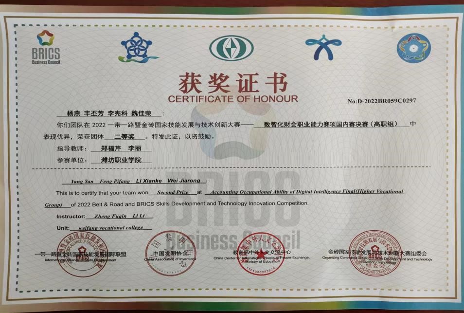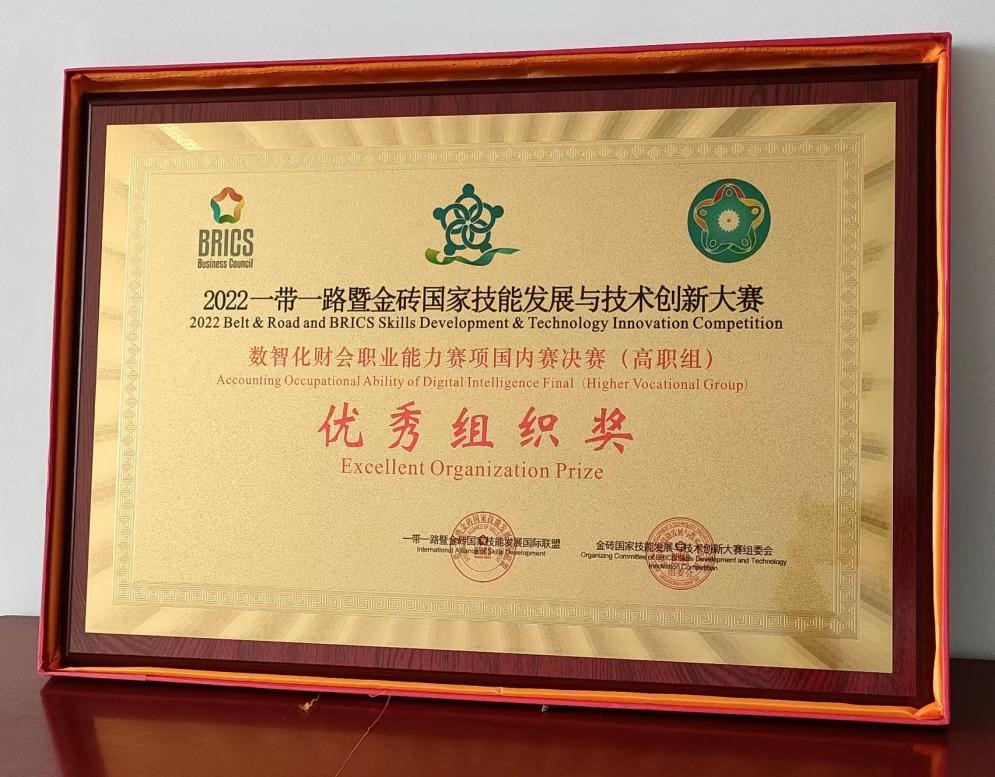 近日,2022年一带一路暨金砖国家技能发展与技术创新大赛“数智化财会职业能力”比赛奖项结果揭晓,我院获得优秀组织奖。