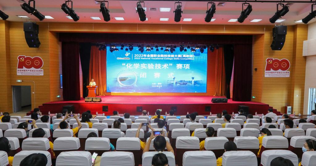 8月17日下午,2022年全国职业院校技能大赛高职组“化学实验技术”赛项闭赛式在我院滨海校区图书馆报告厅举行。全国石油和化工职业教育教学指导委员会副秘书长梅宇烨,教育部职业教育发展中心王蓓爽,赛项专家组组长钱琛,裁判长李邦玉,监督仲裁组组长黄玲,潍坊市滨海区党工委委员、管委会副主任王德志,潍坊市教育局副局长任秀洁,山东(潍坊)公共实训中心主任邵长山,潍坊市教科院职业教育教学研究科科长王述新,潍坊职业学院党委书记马跃启,党委委员、副院长贺志强,党委委员、副院长李瑞昌出席会议。各参赛队领队、指导教师、参赛选手以及新闻媒体等190余人参加会议。党委委员、副院长李瑞昌主持会议。