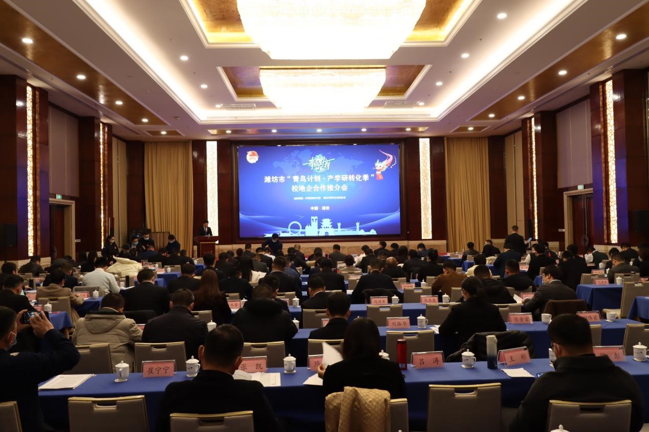 1月9日,潍坊市“青鸟计划·产学研转化季”校地企合作推介会成功召开,本次活动由共青团潍坊市委、潍坊市青年企业家协会共同举办,全市近200名潍坊市青年企业家参加本次活动。中国海洋大学、青岛理工大学和我院现场推介产学研转化情况。学院副院长贺志强参加会议并作为唯一驻潍高校代表作产学研合作方面典型发言。