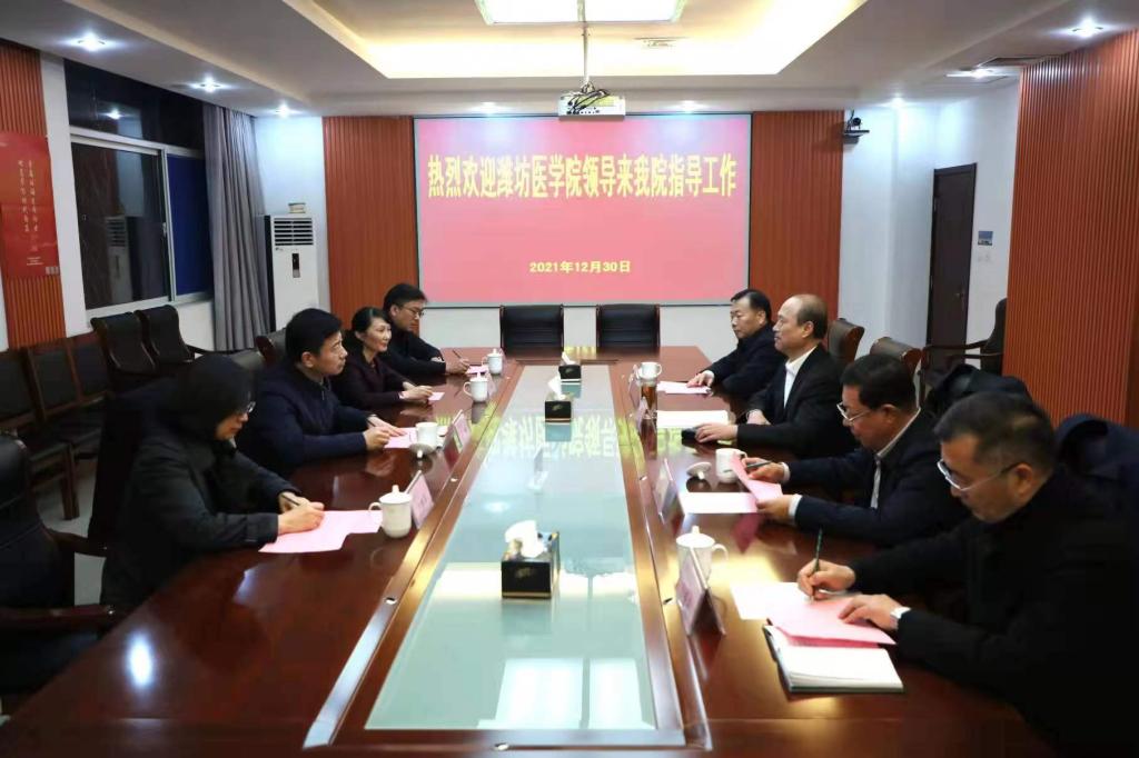 12月30日下午,潍坊医学院党委书记李明、院长管英俊一行4人来我院指导工作。学院党委书记马跃启,党委副书记、副院长桑福岭,党委委员、副院长贺志强,党委委员、办公室(统战部)主任(部长)任培华陪同考察交流。
