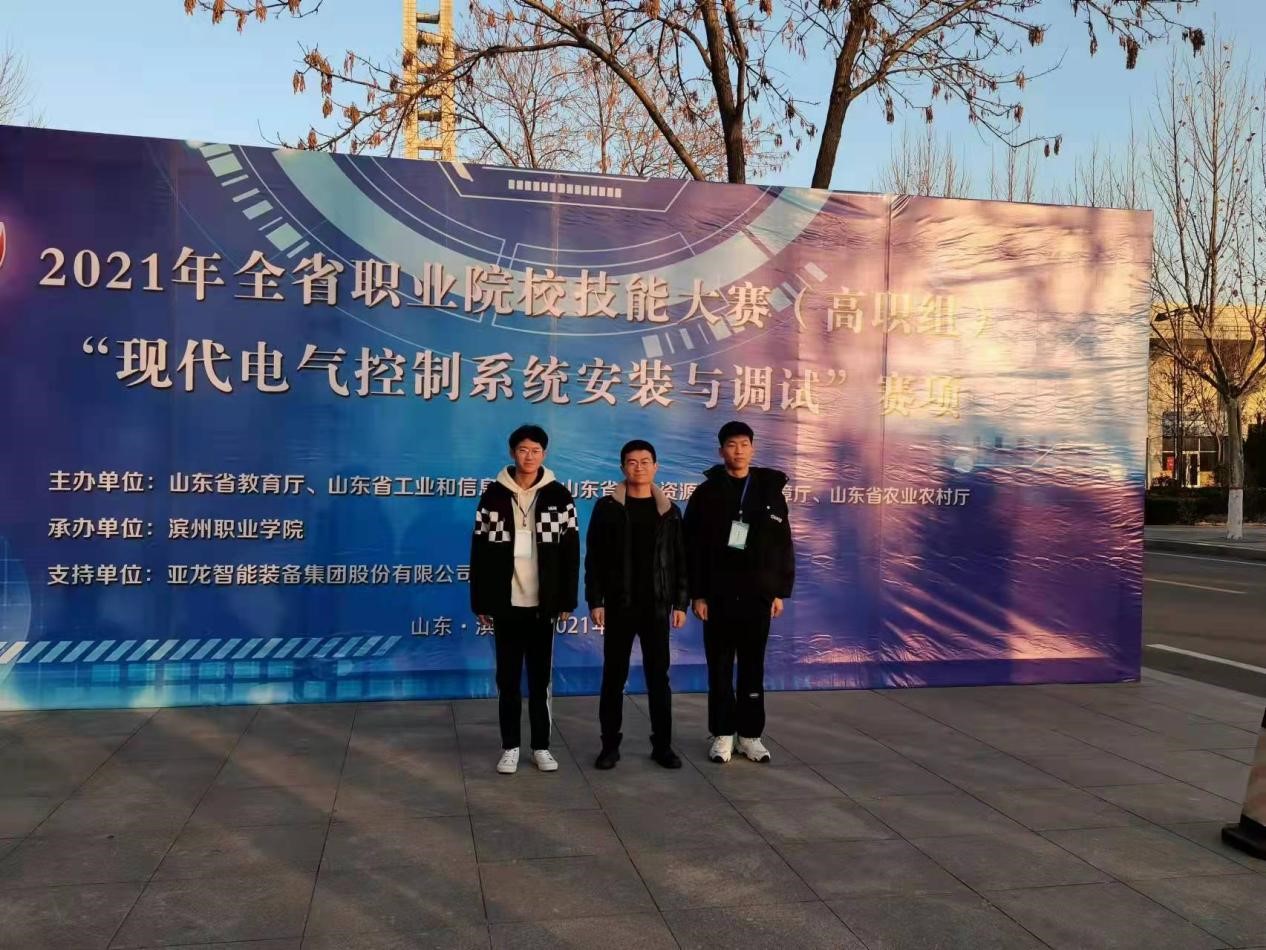 12月19日,2021年山东省职业院校技能大赛(高职组)“现代电气控制系统安装与调试”大赛在滨州职业学院举行,全省44所院校参加比赛。机电工程学院陈贯宇、王桐2位同学在指导教师石海龙、侯绪杰的带领下,沉着应战、配合默契、操作娴熟,最终获得该赛项一等奖。