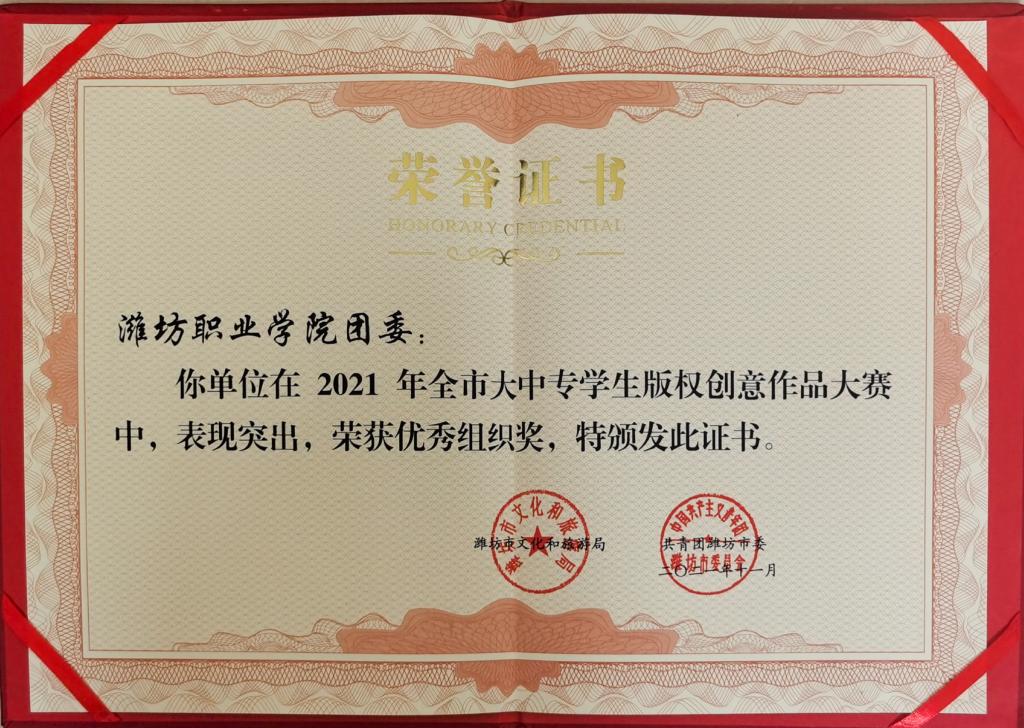 12月3日上午,“潍坊市高校版权服务站”授牌暨2021年全市大中专学生版权创意大赛颁奖仪式在山东省泰山教育创新研究院未来教育体验中心举行,学院被授予“潍坊市高校版权服务工作站”,潍坊市仅4个单位被授予;同时荣获一等奖3项、二等奖3项、三等奖7项,学院团委荣获优秀组织奖。