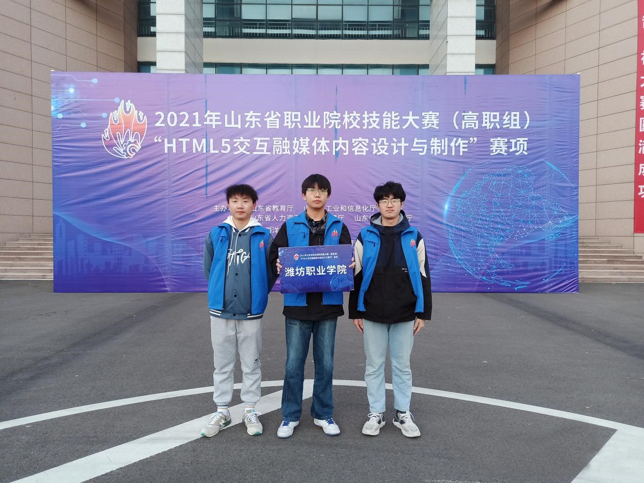 11月25日,2021年山东省职业院校技能大赛(高职组)“HTML5交互融媒体内容设计与制作”大赛在威海海洋职业学院举行,全省51所院校参加比赛。我院信息工程学院焦玉涛、刘统良、张正帅3位同学在指导教师郑伟、冯燕妮的带领下,经过激烈角逐,获得山东省高职组二等奖。