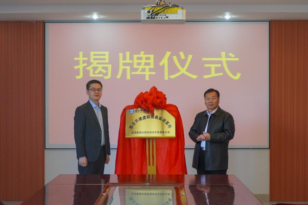 校企双方签订了共建虚拟仿真实训基地协议,北京欧倍尔软件技术开发有限公司为学院捐助总价值375万元的教学软件。贺志强与张成林代表校企双方为“校企共建虚拟仿真实训基地”揭牌。