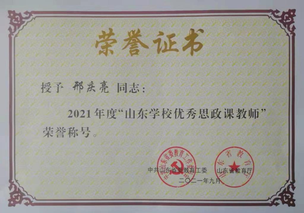 近日,《中共山东省委教育工委山东省教育厅关于公布2021年度“山东学校思政课教师年度人物”“山东高校辅导员年度人物”评选结果的通知》公布,我院思想政治理论课教学部邢庆亮老师荣获“山东学校优秀思政课教师”荣誉称号。