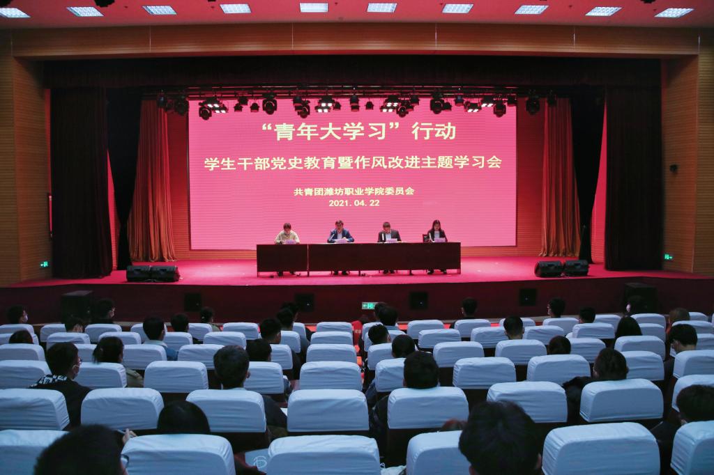 4月22日下午,“青年大学习”行动潍坊职业学院学生会党史教育暨作风改进主题学习会在滨海校区图书馆报告厅举行。团委主要负责同志、校学生会及各二级学院学生会分会全体成员、青年团员代表等200余人参加学习会。