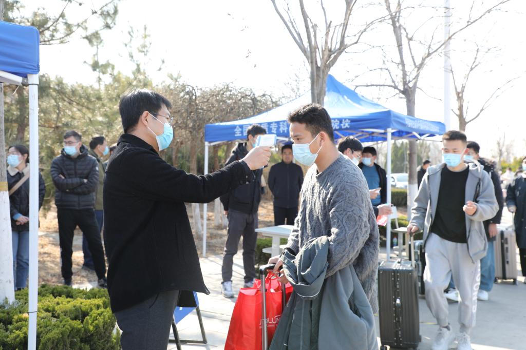 本次演练严格按照《潍坊职业学院2021年春季学期开学学生返校报到演练方案》进行,主要设“学生乘坐私家车报到”、“学生乘坐公交车报到”、“学生身体突发异常处理”、“学生到达公寓入住”、“学生食堂就餐防疫”五个场景。在入校专用通道,演练工作人员对学生进行消杀消毒、体温检测、健康绿码查看、身份核验,重点演练了学生身体异常应急处置程序。在学生公寓,利用人脸翼式速通门禁系统,对学生进出公寓进行双向核验和智能测温人脸识别,演练了学生自感身体不适应急处置流程。