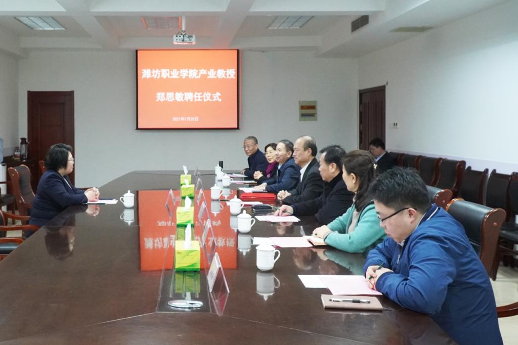 1月25日,学校在奎文校区会议室举行产业教授聘任仪式,聘任得利斯集团有限公司董事长郑思敏为我校产业教授。学校党委书记马跃启,副校长贺志强、李瑞昌出席聘任仪式。相关部门、二级学院主要负责同志参加活动。