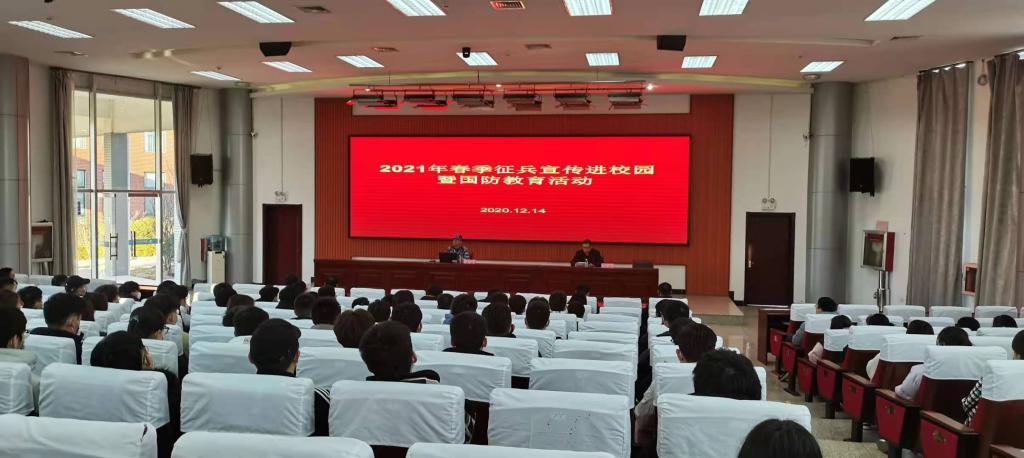 12月14日,应我院人武部邀请,寒亭区人武部政委郜添、参谋王红伟、宣传干事侯永传、武凯及滨海区发展软环境保障局副局长袁华文、武装干事冯伟到我院进行征兵宣讲活动。学院党委副书记宋桂言出席活动,学院人武部相关负责同志、国防教育教研室老师、二级学院负责征兵教师、军事理论课任课老师及学生代表参与。