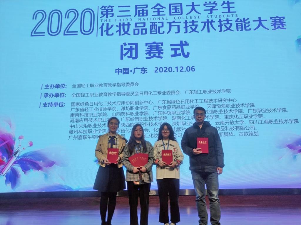 12月5日—6日,由全国轻工职业教育教学指导委员会主办,广东轻工职业技术学院承办的2020年第三届全国大学生化妆品配方技术技能大赛在广东轻工职业技术学院举行,来自广东、山东、天津、河南、江苏等多个省市的70余名参赛选手参加了比赛。我院化妆品技术专业教师王萌、刘苏亭指导的李湘君、荆小涵2名选手在首次参赛的情况下获得团体二等奖,同时获得个人项目二等奖2项、三等奖2项,2名参赛选手同时获得中国轻工联合会颁发的“化妆品配方师”三级职业技能等级证书。