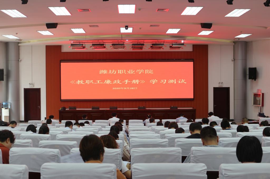 为认真贯彻落实学院2020年党建暨党风廉政建设工作会议精神,扎实做好学院党风廉政建设各项工作,督促学院教职工深入学习运用《教职工廉政手册》相关制度、法规,9月28日下午,学院纪委组织开展了《教职工廉政手册》知识学习测试,各部门、二级学院推荐参加测试人员和学院纪委随机抽测人员共85人参加测试。学院纪委书记、市监委驻潍坊职业学院监察专员郭晓辉到场巡考。
