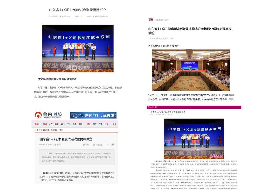 联盟成立后,在社会引起广泛反响,人民网、山东电视台、大众日报、山东教育电视台、潍坊日报、网易等多家新闻媒体进行了集中报道和现场直播,详细介绍了我院牵头组建山东省1+X证书制度试点联盟的情况。