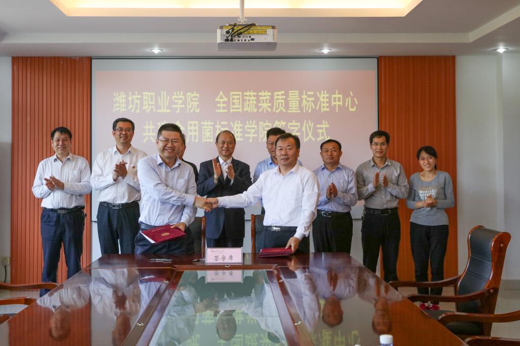 5月25日下午3点,潍坊职业学院与全国蔬菜质量标准中心共建全国蔬菜质量标准中心食用菌研究院合作签约仪式在滨海校区会议室举行。学院党委书记马跃启、副院长贺志强,全国蔬菜质量标准中心党组副书记付乐启、标准中心信息科副科长孙明、标准科负责人胡云生,科研处和农林科技学院主要负责同志参加了仪式。