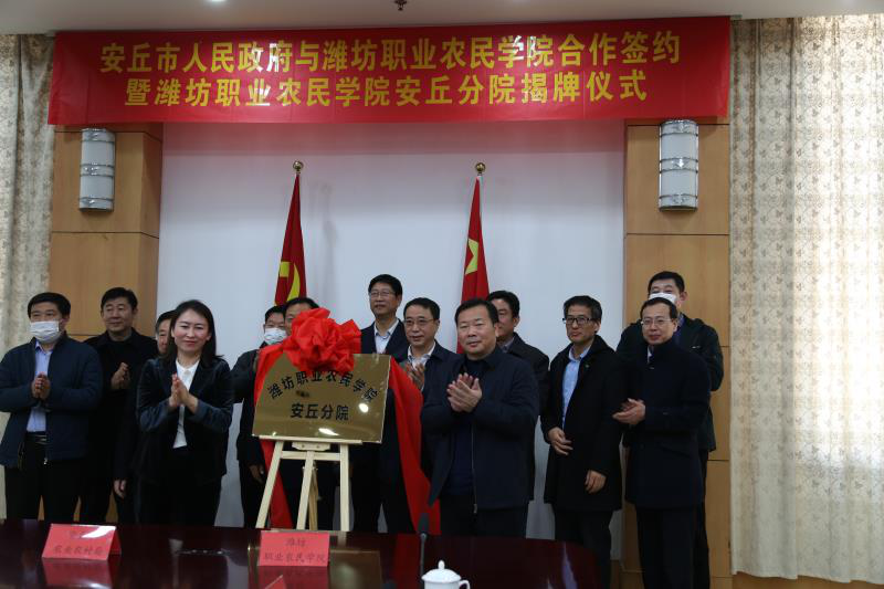 4月3日,潍坊职业农民学院安丘分院揭牌仪式在安丘市人民政府办公大楼举行,学院副院长贺志强与安丘市委副书记刘艳芳共同为分院揭牌。继续教育学院负责同志和安丘市农业农村局局长郭伟共同签署合作协议,合作共建潍坊职业农民学院安丘分院。