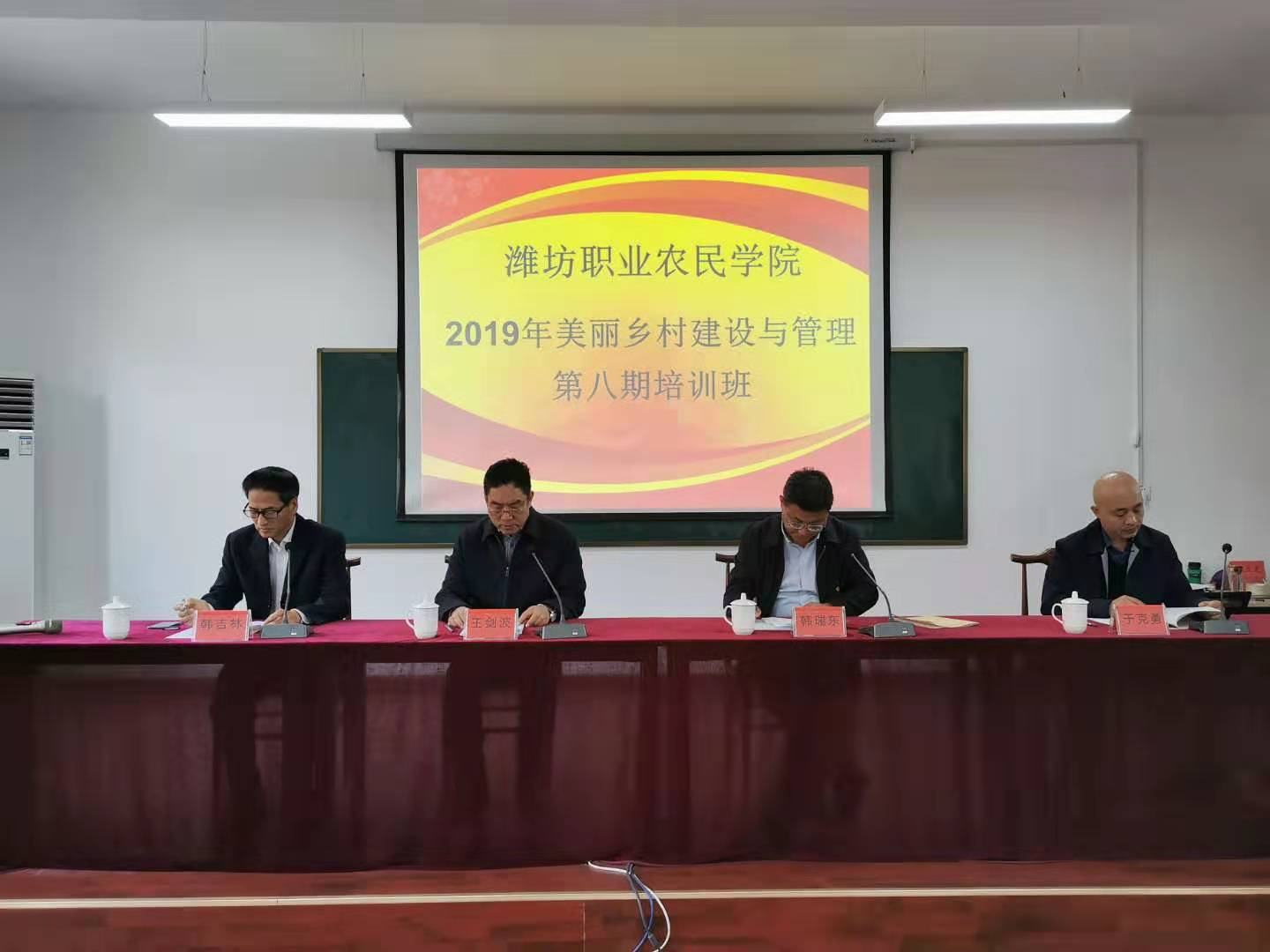 11月7日,由潍坊职业学院联合青州市政府、潍坊普创职业技能培训中心举办的2019年美丽乡村建设与管理第八期培训班在潍坊职业学院培训基地开班,青州市委常委、副市长韩瑞东及继续教育学院负责同志出席开班仪式并致辞。来自青州的潍坊市派第一书记、青州市派第一书记、扶贫村两委成员和部分新型经营主体带头人等共计100余人参加了本次培训。