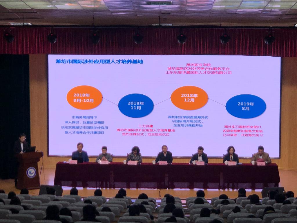 刘振德对潍坊市国际涉外应用型人才基地取得的成果进行总结,并对校企共同培养人才提出希望;李瑞昌总结了学院第一届海外实习国际班情况,为推进我院学生海外实习就业工作,2018年11月由潍坊高新区对外劳务合作服务平台、潍坊职业学院和山东东昊华晨国际人才交流有限公司三方合作共建的潍坊市国际涉外应用型人才培养基地落户我院。随后,启动了学生赴海外实习就业选拔与培训项目,首批由学院国际商务学院推荐的21名学生经过集中培训与面试等环节,已全部被新加坡知名企业录取,开辟了我院大学生海外高端实习就业的新模式。希望各二级学院认真学习借鉴好的经验,积极参与,为学生高质量海外实习就业提供更大帮助。同时,鼓励同学们树立信心,勇敢地走出去,提高国际化视野和综合素质,积累海外实习就业经验,为将来从业打下坚实的基础;潍坊高新区人力资源服务中心副主任夏永红对该区人力资源平台保障潍坊市国际涉外应用型人才基地工作进行了总结;国际商务学院分享了组建第一届海外实习国际班的经验及派出学生的学习工作情况等;合作企业代表就海外实习项目作做了进一步介绍;随后举行了第二届海外实习国际班同学进行授牌仪式。