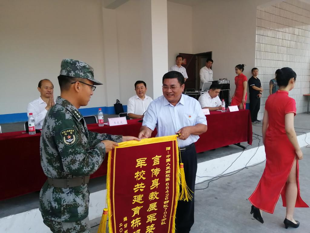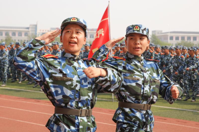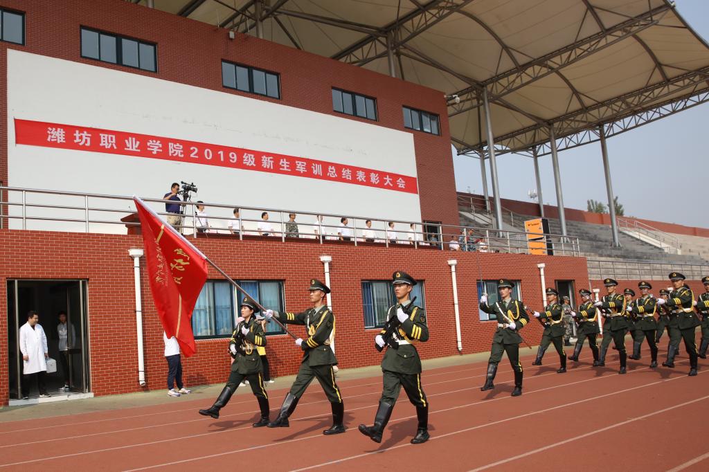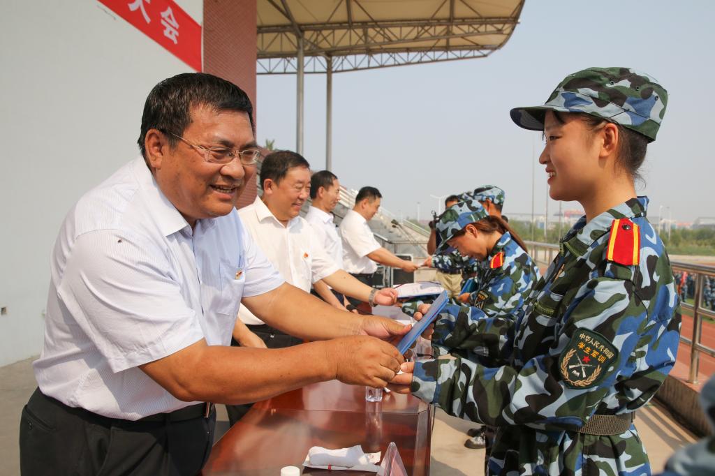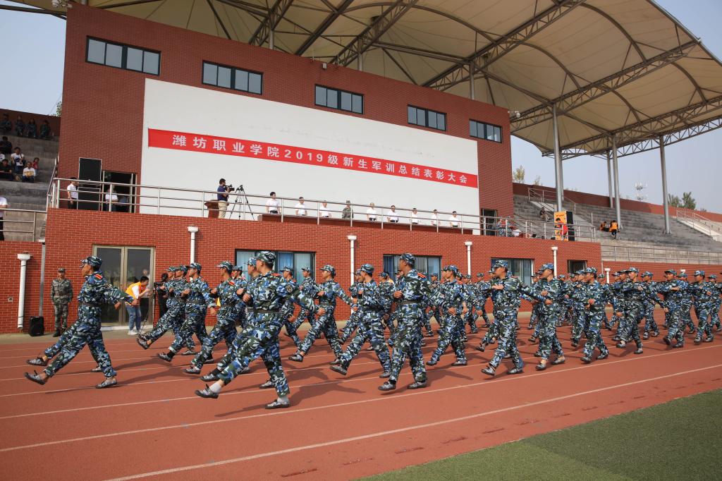 马跃启作讲话。他代表学院党委行政向承担军训任务的全体教官表示感谢,向参加军训的全体新同学表示问候,向受表彰的先进集体和个人表示祝贺。他说,军训是大学生在校期间接受国防教育的基本形式,也是强化学生国防教育、提高军事技能、培养爱国主义精神、增强集体主义意识的重要举措。今年军训工作组织有序、内容丰富,穿插进行了新生入学教育,组织开展了安全教育、内务比赛、歌咏比赛和防震抗灾及消防紧急疏散演习等活动,广大新生学到了军事知识和技能,激发了爱国热情,增强了国防意识和合作意识。军训期间,教官们以身作则、身先士卒、率先垂范、严格要求、科学施训,体现出过硬的军事素质和优良作风。全体受训同学在教官和辅导员、班主任的悉心指导、严格要求下,吃苦耐劳,纪律严明,听从指挥,刻苦训练,用辛勤的汗水和踏实的行动,交出了一份圆满的答卷,充分展示了当代大学生良好的精神风貌和青春魅力。他对同学们提出了希望:一是继续巩固好军训成果,把不怕苦、不怕累的精神,把责任意识、纪律意识和集体观念,带到今后的学习和生活中去。二是弘扬“崇实尚行”潍职文化,发扬“敢于争先”潍职精神,专心学习,苦练本领,尽快成长,努力成才。三是高扬爱国主义旗帜,增强使命担当,矢志不渝听党话、跟党走,与国家、民族同呼吸、共命运。四是希望大家乘新时代春风,放飞青春梦想,为实现“两个一百年”奋斗目标和中华民族伟大复兴的中国梦而努力奋斗,让青春在拼搏中焕发出更加绚丽的光彩。