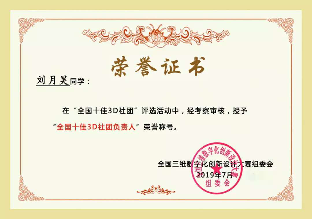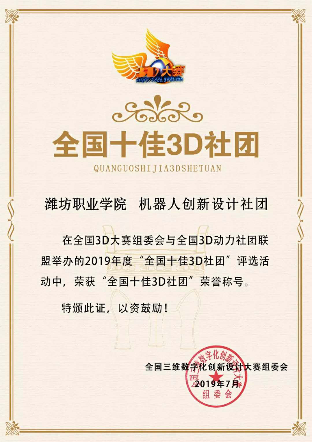 近日,由全国三维数字化创新设计大赛组委会举办的“全国3D动力社团联盟2019十佳社团评选”活动中,我院机器人创新设计社团荣获“全国十佳3D社团”荣誉称号,社长刘月昊同学获得“全国十佳3D社团负责人”荣誉称号。
