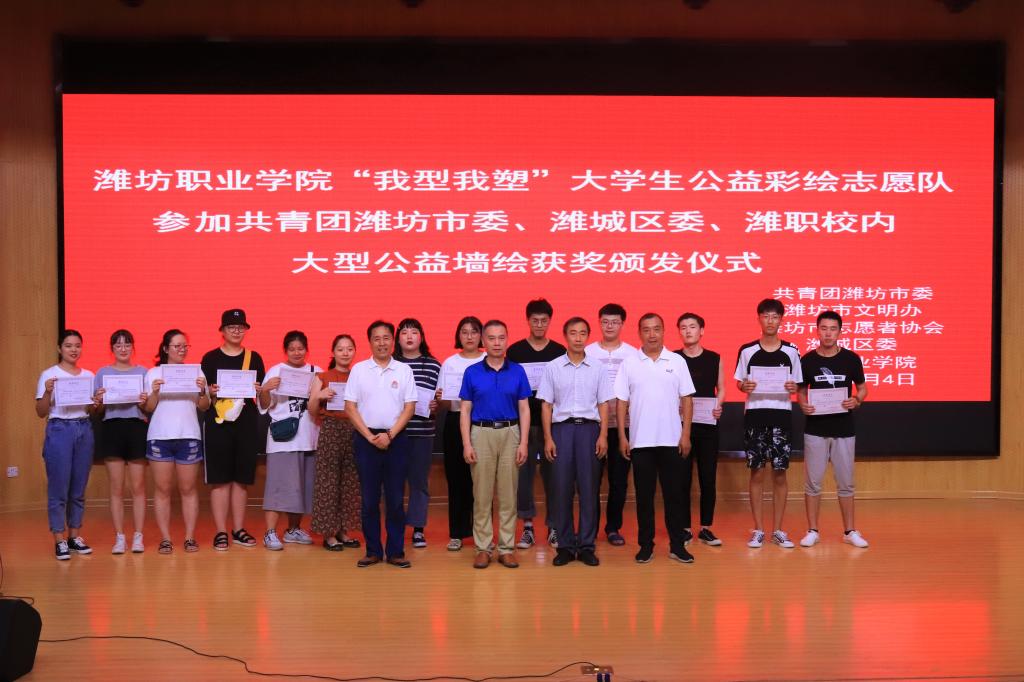 7月4日,我院“我型我塑”大学生公益彩绘志愿队师生分别获得共青团潍坊市委、市文明办、市志愿者协会颁发的“2018年度潍坊市青年志愿服务先进集体”、潍坊市潍城区“新时代文明实践—— 老潍县街巷大型公益绘制活动”驻潍高校组比赛团体一等奖、“优秀指导教师奖”、潍坊职业学院“大学生艺术节绘画奖项”等。2017级动漫制作技术1、2班、2017级环境艺术专业班150余名师生参加会议,文化创意学院主要负责同志出席会议,并为获奖师生颁发了证书。