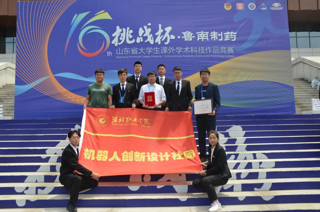 5月28日至30日,第十六届“挑战杯”·鲁南制药山东省大学生课外学术科技作品竞赛终审决赛在齐鲁工业大学(山东省科学院)长清校区举办,我院机电工程学院辛海明、郭大路老师指导的刘月昊、姜云飞、辛丽萍、张昌鹏、胡芳娟五名学生负责的《全数字化枪刺簇绒智能机器人》项目入围终审决赛,经评审组现场质询、个别问辩及名单确定三个环节的严格评审,荣获省级特等奖。我院是全省唯一一所荣获特等奖的高职院校,同时学院获得优秀组织奖。