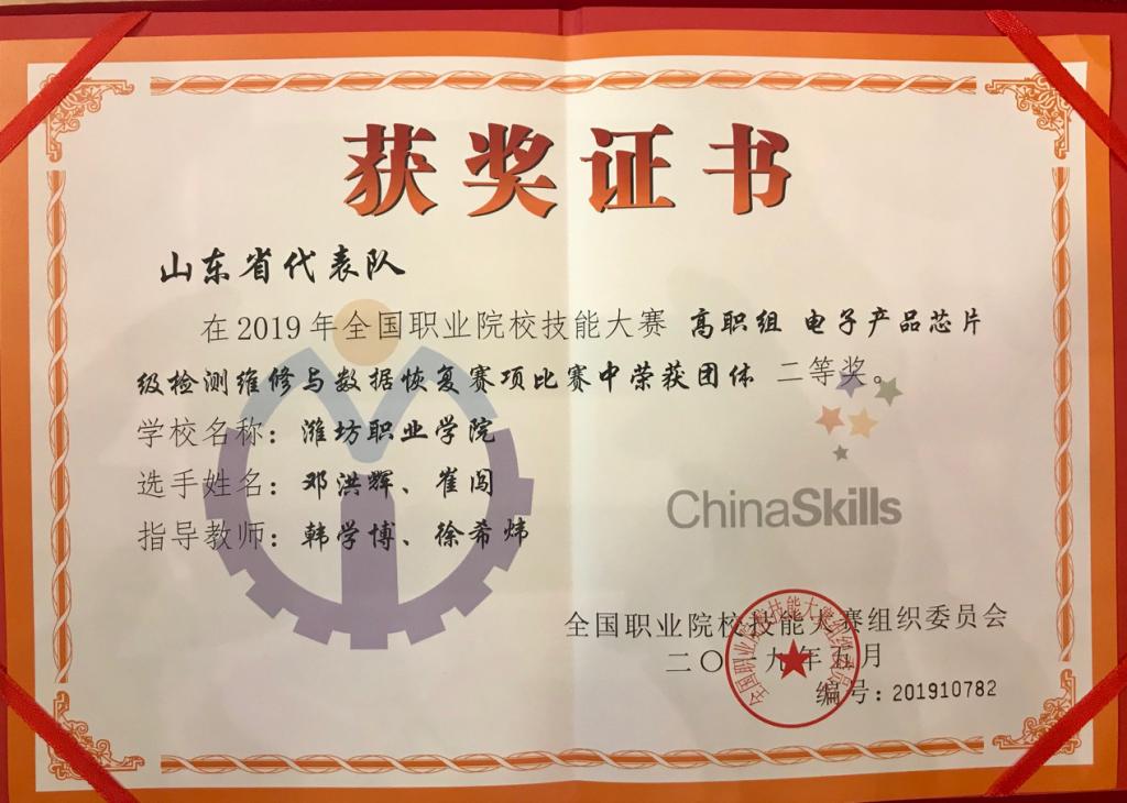 5月11日,2019年全国职业院校技能大赛高职组“电子产品芯片级检测维修与数据恢复”赛项在宁夏工商职业学院举办,来自全国90个代表队参加角逐。我院学生邓洪辉、崔闯同学组成的代表队获得团体二等奖。