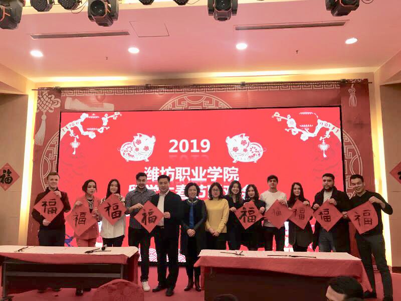 谭明致辞,代表学院向外籍教师及留学生们送上了新春祝福和学院领导的关怀。联欢会现场春联、福字、贴花将活动大厅装扮得极富中国年味。晚会播放了留学生们在潍职学习生活视频集锦,回顾了他们来潍职近半年学习生活的点点滴滴和精彩瞬间。联欢会组织了丰富多彩的歌舞表演、你来比划我来猜汉字比赛、抽奖互动小游戏等,在老师的指导下,同学们用毛笔临摹了寓意吉祥幸福的“福”字贴,大家载歌载舞,品尝具有中国特色的美食--饺子等,全场洋溢着欢乐祥和的节日氛围。活动中学生们争相拍照留念,并将精彩瞬间发给遥远的亲朋好友,传达了他们在中国潍坊职业学院平安快乐的学习和生活情况。本次活动留学生们亲身体验了中国最重要的节日-春节的文化习俗,成为在华留学难忘的记忆,留学生们对学院周到安排深表谢意。