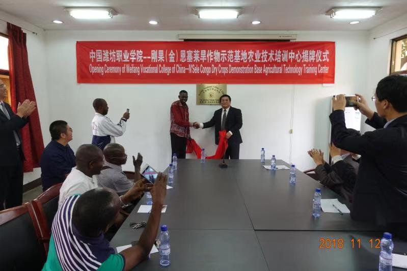 在中国援助非洲“恩塞莱旱作物示范推广项目”基地,王家爱一行探望了我院援非农业专家王效华和李凯两位老师,带去了学院领导和师生的亲切问候,并在该基地隆重举行了潍坊职业学院刚果(金)农业技术培训中心揭牌仪式。王家爱与刚果(金)国家战略储备局战略运营官艾劳为培训中心揭牌并发表致辞。王家爱在致辞中指出,学院与刚果(金)农业援建项目有着良好的合作基础,先后选派四批农业专家参与“恩塞莱旱作物示范推广项目”,推动了先进农业技术在刚果(金)的推广应用。艾劳在致辞中对学院多年来对刚果(金)农业技术推广培训做出的贡献表示感谢,期待学院以培训中心为平台,为刚果(金)培训更多的农业技术人才。刚果(金)国家战略储备局首席农业专家巴布以及山东国际经济技术合作集团有限公司非洲区总部副总经理袁合烈等中刚双方人员出席了揭牌仪式。揭牌仪式后,王家爱一行到基地实验室和种植示范基地等现场进行了参观。
