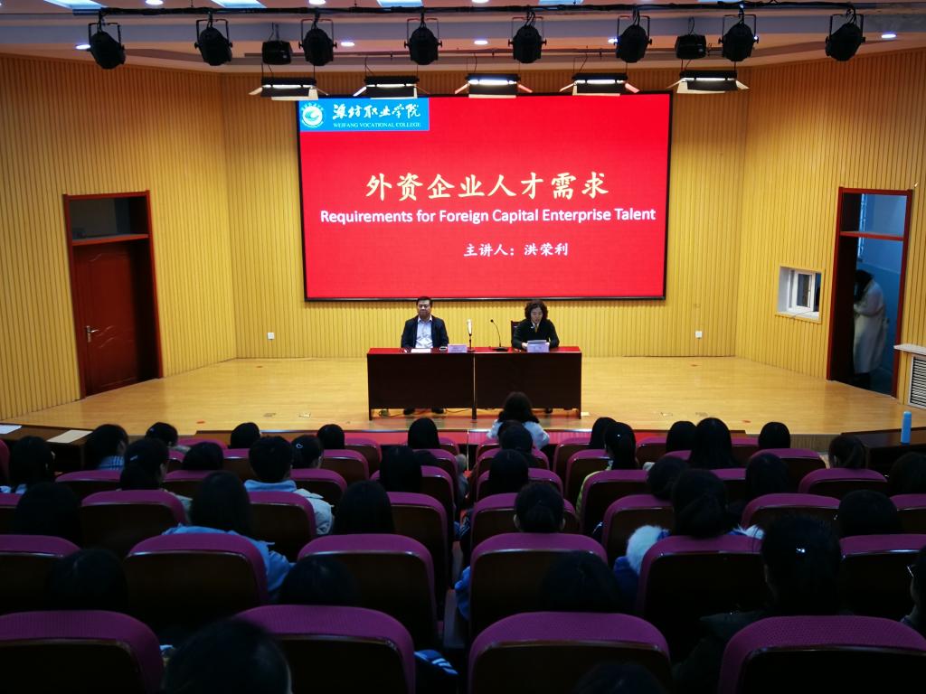 11月22日下午,新加坡商会山东分会会长、潍坊乔新集团董事长洪荣利先生在我院创新创业楼报告厅为我院师生作了题为“外资企业人才需求”的讲座,国际商务学院和国际教育学院100余名师生参加了报告会。