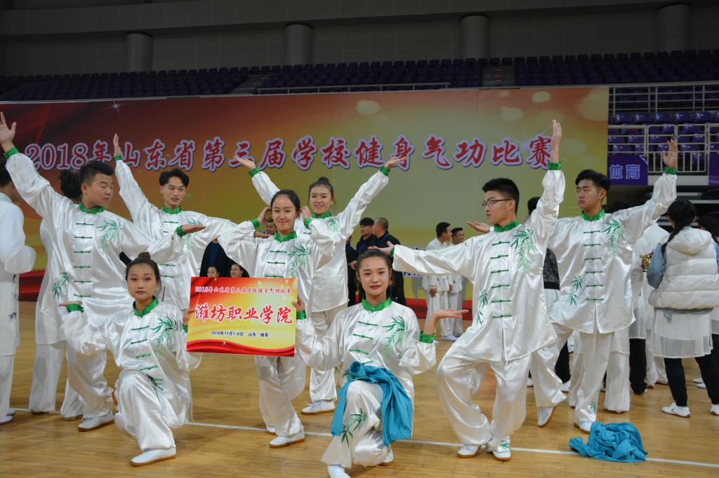 11月8日,山东省体育局、山东省教育厅主办的山东省第三届学校健身气功比赛在曲阜举办。我院通识教育中心刘秀东同志带队,共有2名教师、16名学生参加了比赛。经过激烈角逐,朱邦辉获得个人项目八段锦第二名,田托获得个人项目五禽戏第二名;由刘秀东、朱邦辉、田托指导的16名学生分别获得集体自选项目第二名和集体传统项目(五禽戏)第二名的好成绩。