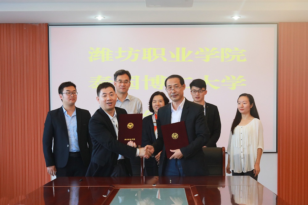 赵君堂介绍了学院的办学规模、专业设置、人才培养、国际交流、留学生教育情况以及所取得的丰硕成果等,并陪同客人观看了学院宣传片。李黎光介绍了泰国博仁大学的基本情况、办学特色、中国-东盟学院的发展历史和现状,以及博仁大学中国-东盟学院在专升本、升硕相关项目中所设立的中、英、泰语言授课的专业等情况。双方就学生学历提升、留学生招生等相关问题进行了深入交流和探讨,就校际互访、学生交流、教师研修等达成合作意向,并签署了合作备忘录。签约仪式结束后,李黎光一行在赵君堂副院长陪同下参观了滨海校区图书馆。