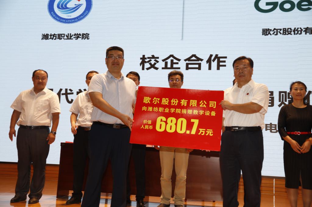 贺志强代表学院接受歌尔公司捐赠680余万元的数控及自动化设备,并与歌尔精密制造事业群总经理刘凯共同签署了《潍坊职业学院与歌尔股份有限公司现代学徒制人才培养协议》。