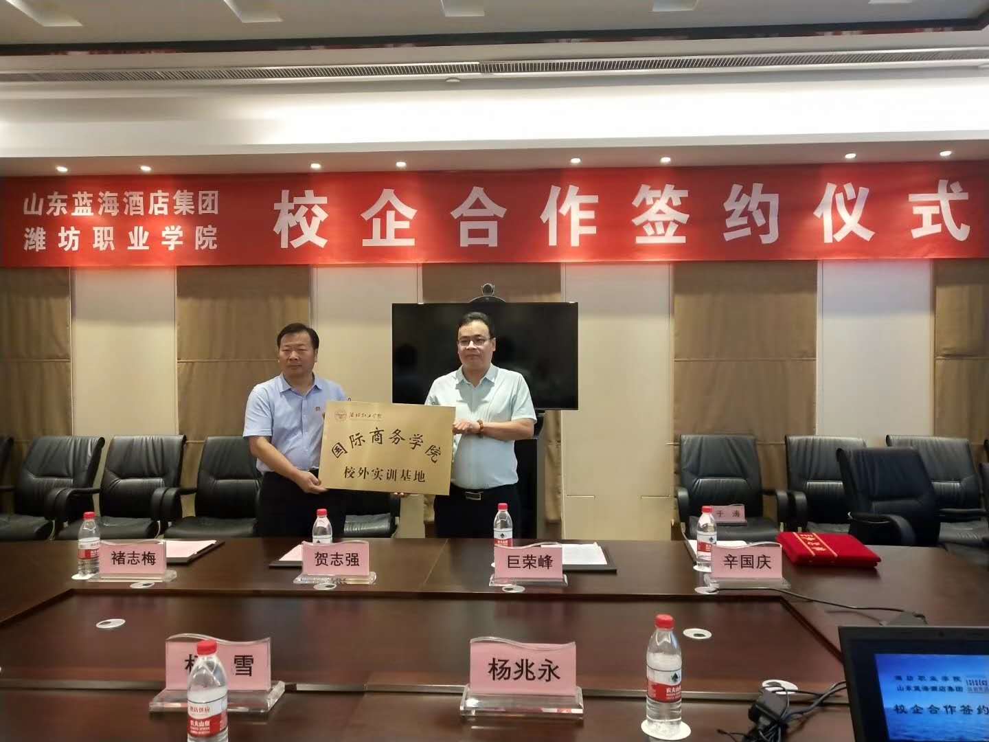9月6日上午,我院与山东蓝海股份有限公司战略合作协议签署及校外实训基地授牌仪式在潍坊蓝海大饭店举行。学院副院长贺志强,山东蓝海股份有限公司人力资源部副总经理杨兆永出席仪式,科技处、国际商务学院负责同志参加活动。